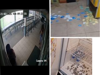 Imagens do circuito interno de segurança mostram um homem invadindo o local, quebrando portas, furtando objetos — inclusive um televisor — e fugindo logo em seguida.