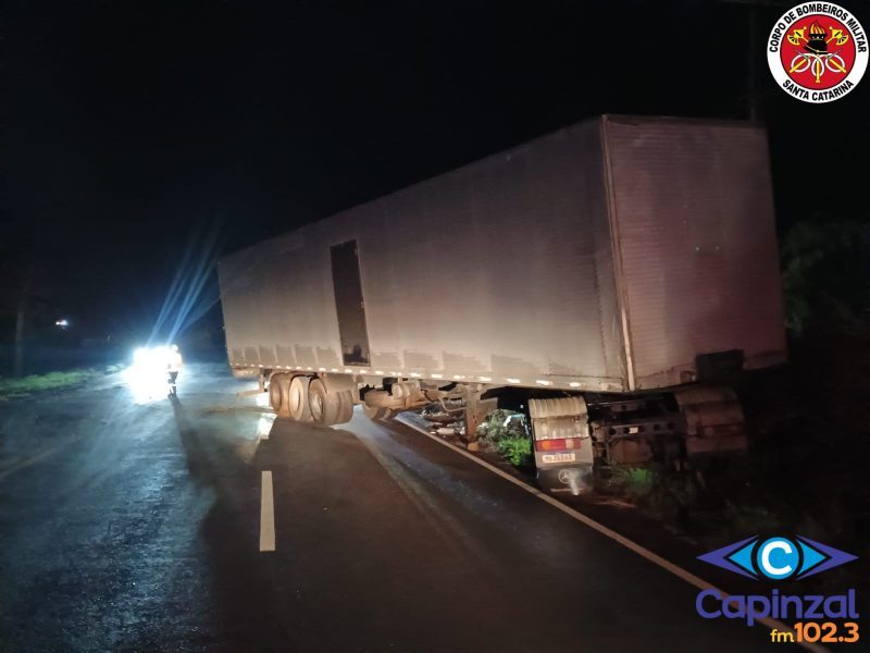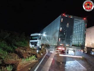 A ocorrência, registrada por volta das 20h25min, mobilizou duas viaturas do OBM de Lebon Régis. No local, as guarnições confirmaram se tratar de uma saída de pista envolvendo um caminhão Mercedes-Benz Axor, de cor branca.