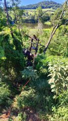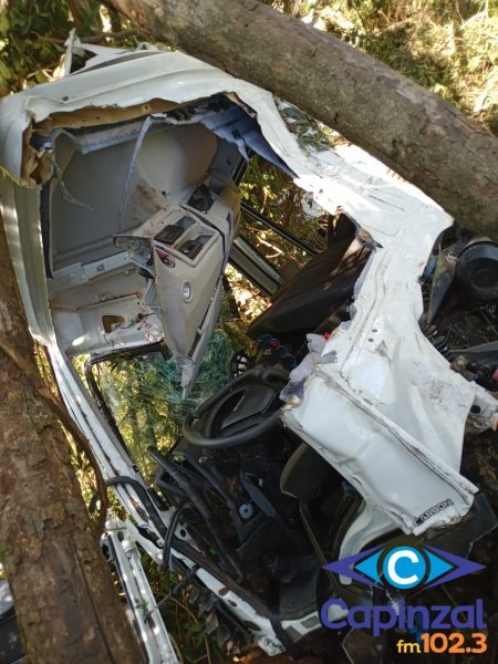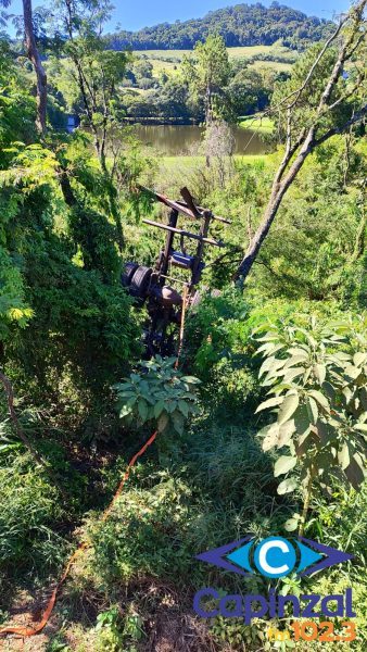 No local, os socorristas constataram que o caminhão saiu da pista e despencou por uma ribanceira de aproximadamente 10 metros, parando com a cabine apoiada sobre uma árvore. O cenário exigiu atenção redobrada das equipes devido à instabilidade do veículo.