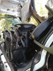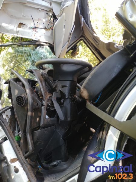 O condutor foi encontrado no interior da cabine, consciente e orientado, porém com ferimentos na face e em situação de encarceramento tipo físico II, com ferragens comprimindo a vítima pelo teto e painel.