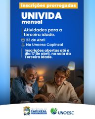 A Administração Municipal de Capinzal está com inscrições abertas para a Univida, um programa voltado à promoção da qualidade de vida da população idosa. A iniciativa é realizada em parceria com a Prefeitura e a Universidade do Oeste de Santa Catarina - UNOESC, oferecendo encontros mensais com atividades focadas no bem-estar, convivência e valorização do envelhecimento ativo.
