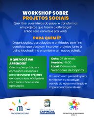 A Prefeitura de Capinzal, por meio da Secretaria Executiva dos Conselhos, realiza no próximo dia 7 de maio um workshop voltado à elaboração de projetos sociais. A iniciativa conta com a parceria da Usina Machadinho e tem como objetivo capacitar organizações, associações e entidades sem fins lucrativos do município.