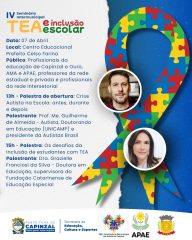 Capinzal sediará, nesta terça-feira (7), a partir das 19h, o IV Seminário Intermunicipal “TEA e Inclusão Escolar”. O evento será realizado no Centro Educacional Prefeito Celso Farina e é aberto às famílias, profissionais da educação e à comunidade em geral.