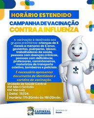 A Secretaria de Saúde de Capinzal promove, nesta quarta-feira (15), uma ação especial com horário estendido para vacinação contra a gripe em três unidades de saúde do município. A imunização estará disponível das 17h30 às 19h30 na Unidade de Saúde Central, no ESF São Cristóvão e no ESF São Luís.
