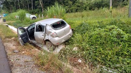 Carro sai da pista após desviar de cachorro na SC-150, em Capinzal