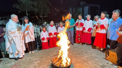 A celebração começou no lado externo da igreja, onde os fiéis participaram do rito da Bênção do Fogo Novo, diante de uma fogueira preparada especialmente para o momento. A partir dessa chama, foi aceso o Círio Pascal, símbolo de Cristo ressuscitado, em um ambiente de profunda reverência e alegria.