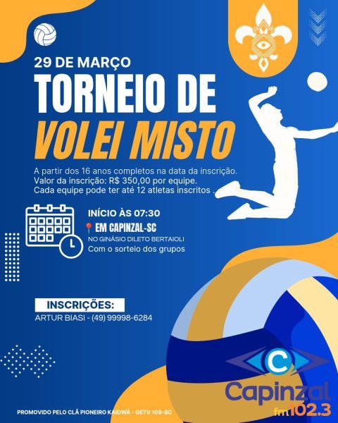 O esporte e a integração prometem tomar conta de Capinzal no próximo dia 29 de março. O Clã do grupo Escoteiro está promovendo um Torneio de Vôlei Misto, que será realizado ao longo de todo o domingo no Ginásio Municipal Dileto Bertaiolli.