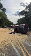 O motorista da carreta, um Volvo FH 500, foi localizado caminhando pela cena do acidente, consciente e orientado, apresentando escoriações. Ele foi atendido e levado ao Hospital Regional de São Miguel do Oeste para avaliação.