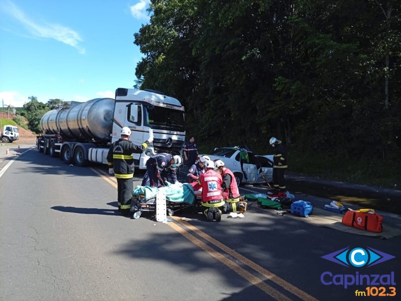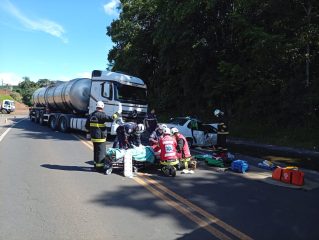 Colisão frontal entre carro e carreta deixa um morto e um ferido grave na BR-153, em Concórdia