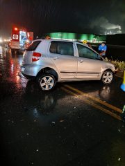 No local, próximo à empresa Berneck, foi confirmada uma colisão frontal envolvendo um veículo VW/Fox e um caminhão Mercedes-Benz. O condutor do carro, um homem de 45 anos, foi encontrado inconsciente e preso às ferragens pelas pernas.