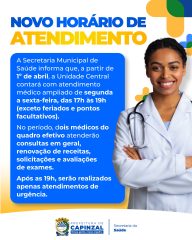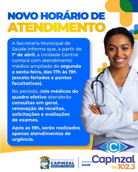 A Prefeitura de Capinzal, por meio da Secretaria Municipal de Saúde de Capinzal, anunciou a ampliação no horário de atendimento médico da Unidade Central. A medida passa a valer a partir do dia 1º de abril. Conforme informado, o atendimento será estendido de segunda a sexta-feira, das 17h às 19h, com exceção de feriados e pontos facultativos.