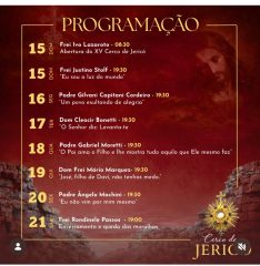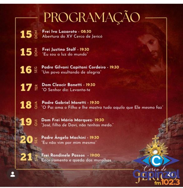 A abertura ocorre no domingo, dia 15, às 8h30, com celebração presidida pelo Frei Ivo Lazzaroto, marcando o início oficial do Cerco de Jericó. Ainda no mesmo dia, às 19h30, a celebração será conduzida pelo Frei Justino Stolf, com a reflexão “Eu sou a luz do mundo”.