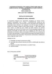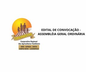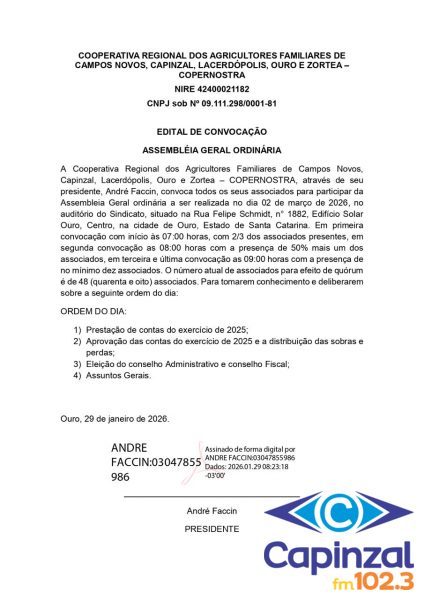 A Cooperativa Regional dos Agricultores Familiares de Campos Novos, Capinzal, Lacerdópolis, Ouro e Zortea – COPERNOSTRA, através de seu presidente, André Faccin, convoca todos os seus associados para participar da Assembleia Geral ordinária a ser realizada no dia 02 de março de 2026, no auditório do Sindicato, situado na Rua Felipe Schmidt, n° 1882, Edifício Solar Ouro, Centro, na cidade de Ouro, Estado de Santa Catarina.