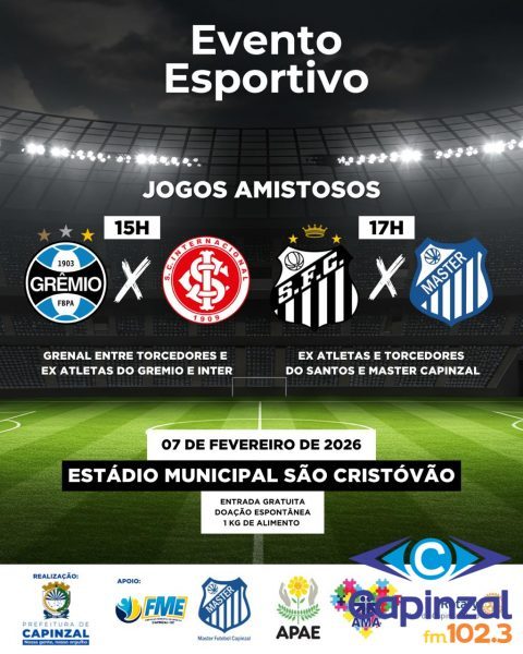 Capinzal vai respirar futebol e solidariedade no sábado, dia 07 de fevereiro, com um grande evento esportivo que integra as comemorações dos 77 anos do município. A programação acontece ao longo do dia, no Estádio do Bairro São Cristóvão, com entrada gratuita, reunindo esporte, comunidade e ações solidárias.