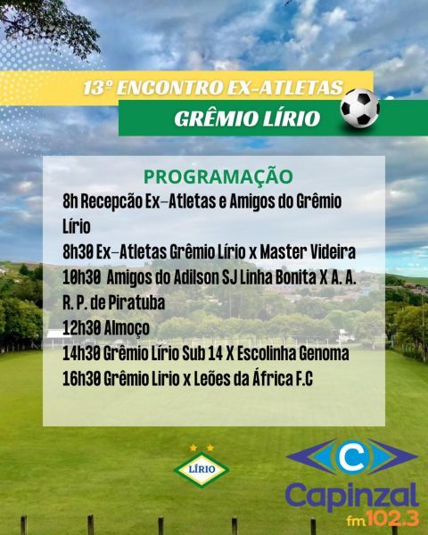 O Grêmio Esportivo Lírio realiza neste domingo, dia 08, o 13º Encontro de Ex-Atletas, reunindo história, amizade e muito futebol no Complexo Esportivo Olivo Susin (Pinheirão), no município de Zortéa. A programação será extensa e promete movimentar o esporte local ao longo de todo o dia, com jogos em diferentes categorias e a presença de equipes convidadas da região.