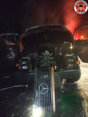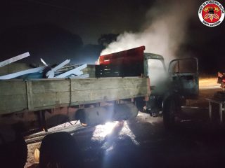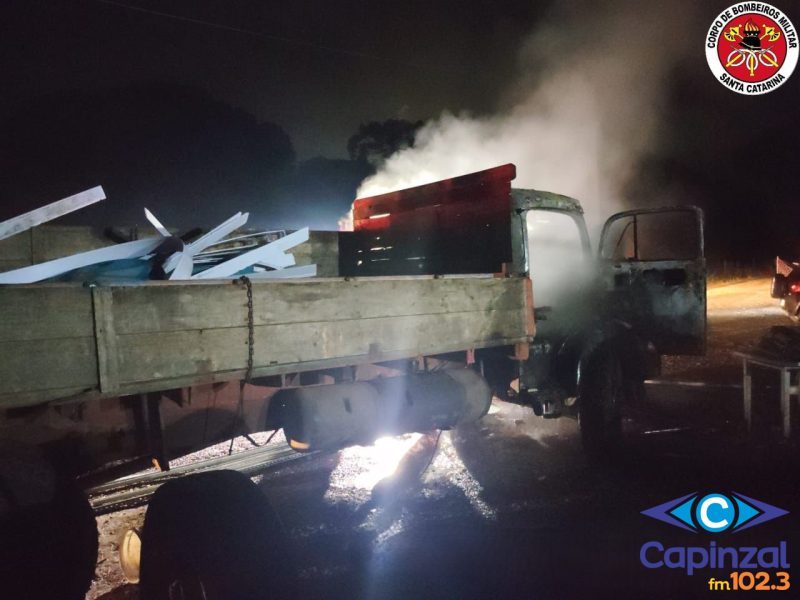 Ao chegar no local, as guarnições confirmaram a ocorrência e identificaram um caminhão Mercedes-Benz 1113 com a cabine e o motor já tomados por fumaça e chamas.