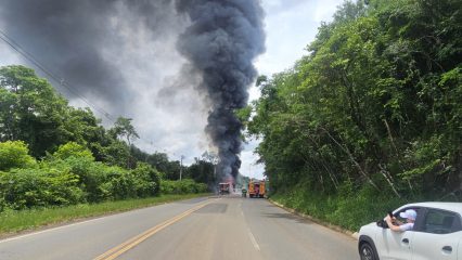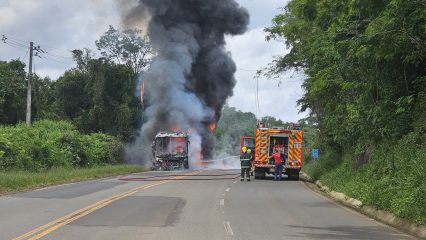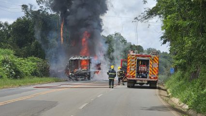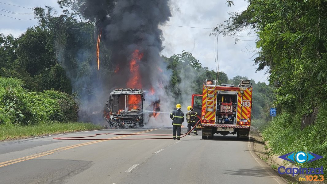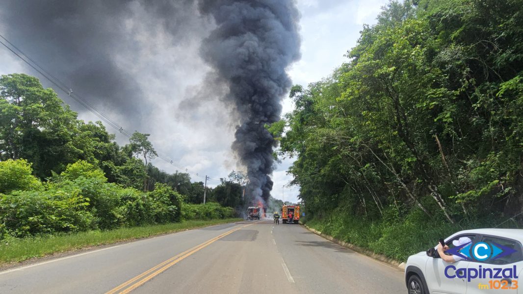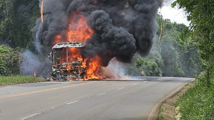 Incêndio consome ônibus na SC-150 entre Ouro e Lacerdópolis