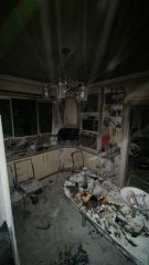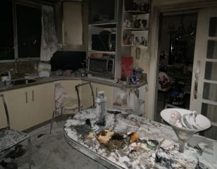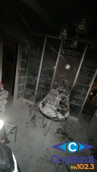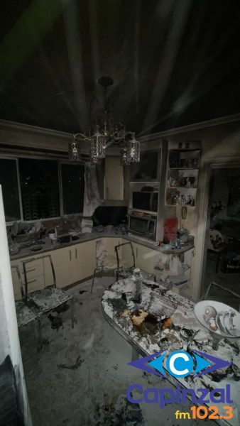 No interior do apartamento, foi constatado que uma mesa com quatro cadeiras, além de outros móveis e utensílios domésticos, foram danificados pela ação do fogo e pela alta temperatura.