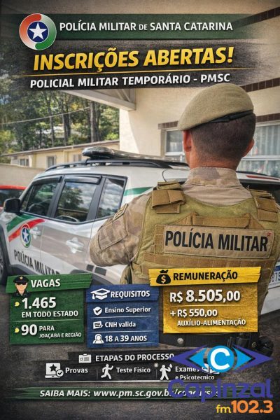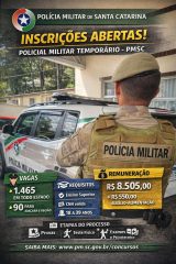 A Polícia Militar de Santa Catarina está com inscrições abertas, desde a última terça-feira, dia 23 de dezembro, para o Processo Seletivo Simplificado de Soldado Policial Militar Temporário, conforme previsto no Edital nº 200/CCP/2025.