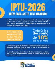 Os contribuintes de Capinzal já podem acessar as guias do IPTU 2026 a partir desta segunda-feira, dia 13. A emissão pode ser feita de forma online, pelo site da prefeitura, ou presencialmente em diferentes pontos de atendimento do município.