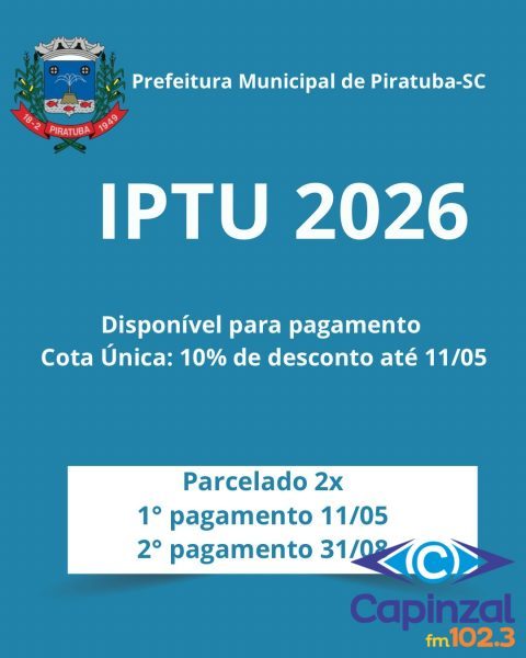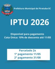 A Administração Municipal informa que o Imposto Predial e Territorial Urbano (IPTU) já está disponível para pagamento. Os contribuintes podem optar pelo pagamento em cota única ou de forma parcelada.