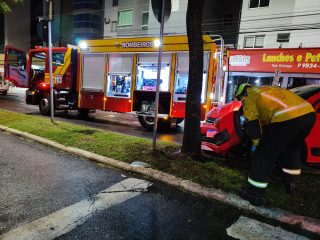 No local, os bombeiros constataram que se tratava de uma VW/Saveiro que, após perder o controle direcional, colidiu contra uma árvore no canteiro central da via.