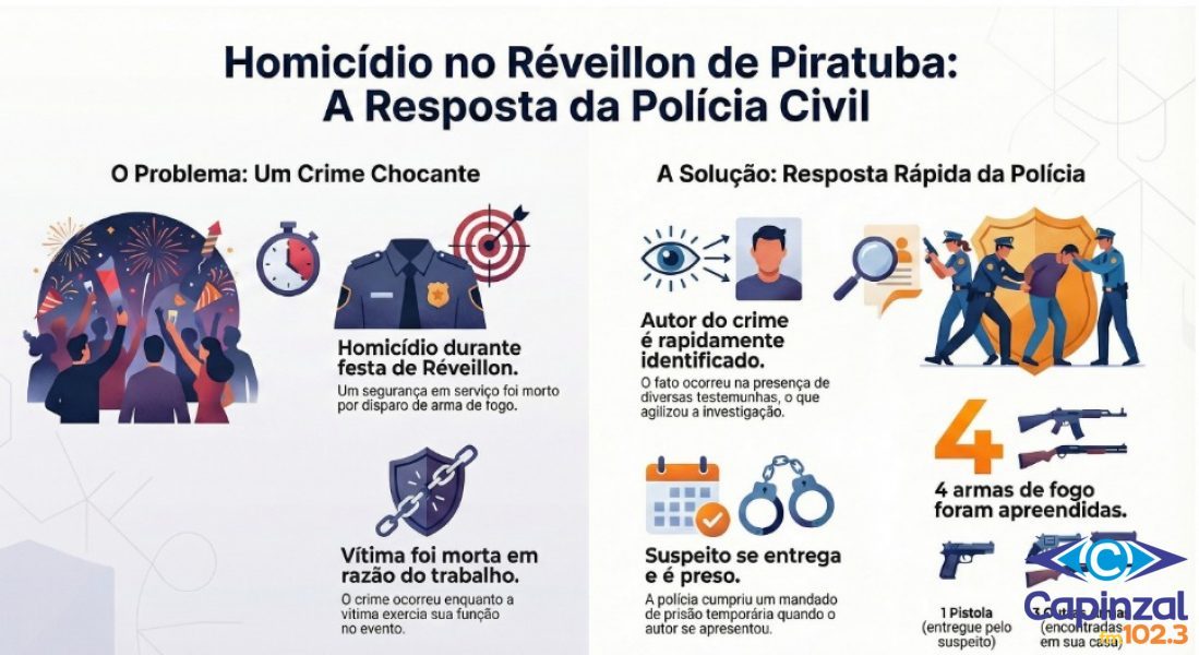 Nesta sexta-feira (02), o autor do crime, de 41 anos, apresentou-se espontaneamente na delegacia local, ocasião em que foi dado cumprimento a mandado de prisão temporária, expedido ainda na data de ontem, após representação da Polícia Civil. No momento da apresentação, o investigado entregou uma pistola calibre .380. Em sequência, os policiais civis também cumpriram mandado de busca e apreensão na residência do suspeito, onde foram localizadas e apreendidas outras três armas de fogo.
