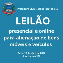 A Prefeitura Municipal de Piratuba promove, no próximo dia 10 de abril de 2026, um leilão público de veículos e bens móveis pertencentes ao município. O evento será realizado de forma simultânea presencial e online, ampliando as possibilidades de participação dos interessados.