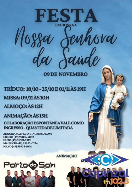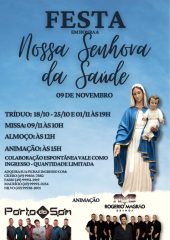 O ponto alto da programação será no dia 9 de novembro, data da festa em honra a Nossa Senhora da Saúde. A programação contará com Santa Missa às 10 horas, seguida de almoço ao meio-dia e, a partir das 15 horas, matinê com Porto do Som e Rogério Magrão e Banda. A colaboração espontânea valerá como ingresso.