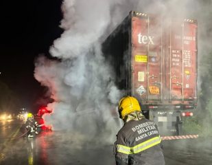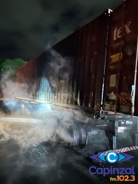 Princípio de incêndio atinge rodado de carreta carregada com baterias na BR-282, em Joaçaba