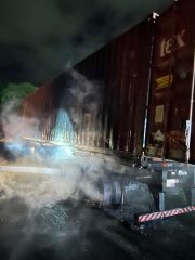 Ao chegar ao local, os bombeiros constataram que o incêndio atingia um caminhão Iveco, acoplado a uma carreta contêiner carregada com baterias automotivas. As chamas estavam concentradas no rodado traseiro direito da carreta, com a lateral metálica apresentando alta temperatura devido à propagação do calor.