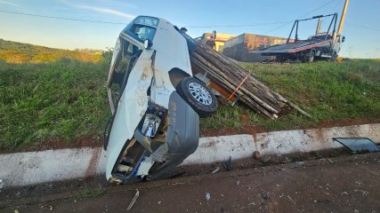 Veículo acoplado a carretinha sai da pista na SC-467, em Capinzal