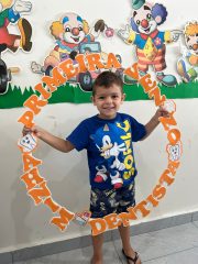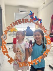 Ao final do atendimento, as crianças receberam picolés de fruta e massinhas de modelar, como forma de incentivo e de reforço positivo à experiência no consultório odontológico. A estratégia buscou associar o cuidado com a saúde a momentos de acolhimento e bem-estar.
