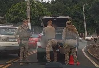 Durante a abordagem, o homem tentou fugir, sendo necessário o uso de força para contê-lo. Em seguida, os policiais constataram que ele estava foragido do sistema prisional. Na busca realizada no interior do veículo, foram encontradas porções de crack, maconha e cocaína.