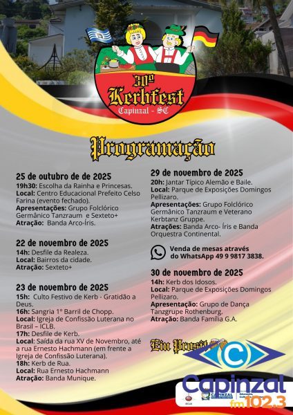 Na tarde desta segunda-feira, 29 de setembro, na sala de reuniões da Prefeitura de Capinzal, houve a divulgação da programação oficial do 30º Kerbfest, festa que celebra a cultura germânica e tradicional do município. O evento, promovido pela Comunidade Evangélica Luterana de Capinzal, em parceria com a Secretaria Municipal de Educação, Cultura e Esportes, contará com apresentações culturais, desfiles, música típica e atrações para todas as idades.