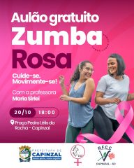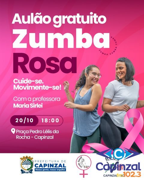 A Praça Pedro Lélis da Rocha, em Capinzal, será palco de muita animação e conscientização nesta segunda-feira, dia 20 de outubro. A partir das 18h, ocorre o Aulão Gratuito de Zumba Rosa, uma iniciativa que une movimento, saúde e solidariedade em apoio à campanha Outubro Rosa, intitulada "Escolhas Saudáveis, Vida Protegida".