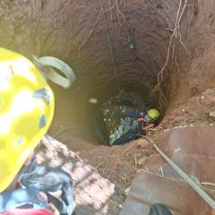 A equipe realizou a descida controlada no poço utilizando o sistema de rapel guiado. Em seguida, as pernas do animal foram amarradas com cintas de carga, permitindo que o bovino fosse içado com segurança para fora do poço, com o auxílio de um caminhão munck.