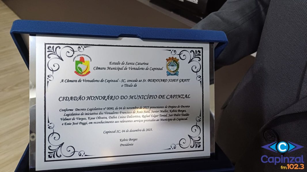 A Câmara de Vereadores de Capinzal realizou, na noite desta quinta-feira, 4 de dezembro, uma sessão solene para a entrega do Título de Cidadão Honorário ao empresário Bernhard Josef Gratt, fundador da Gratt Indústria e Tecnologia Ambiental. A honraria havia sido aprovada por unanimidade na 40ª sessão ordinária, realizada em 3 de novembro, por meio do Projeto de Decreto Legislativo nº 1/2025.