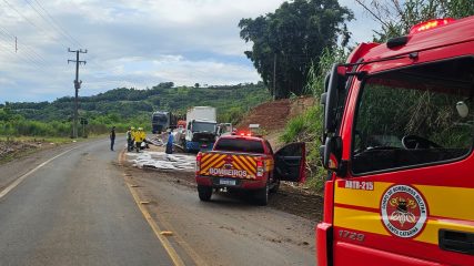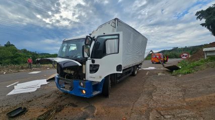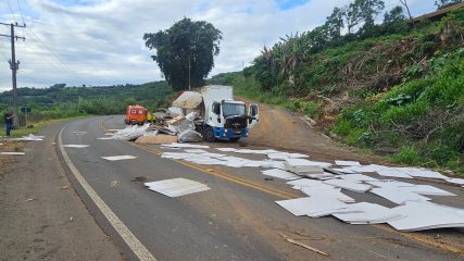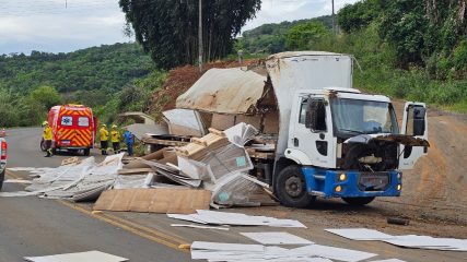 Com o impacto, a lateral do baú do caminhão ficou danificada e os paletes da carga se espalharam pelo local. A Polícia Militar foi acionada, e o trânsito segue em meia pista.