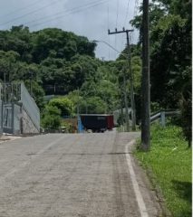 O condutor não conseguiu concluir a subida para acessar a Avenida José Leonardo Santos. Ao tentar acessar a rua lateral, ficou sem tração nas rodas e acabou ficando atravessado. O veículo transporta apenas um pallet de produtos (praticamente vazio).