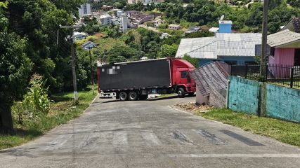 Caminhão fica atravessado em rua íngreme de Capinzal após ser "traído" pelo GPS