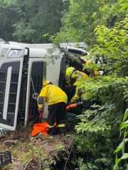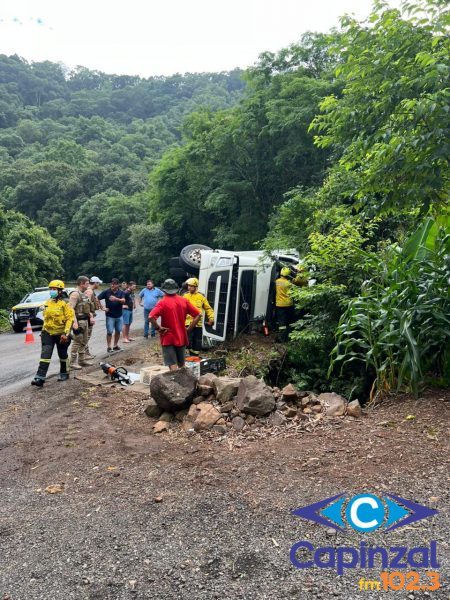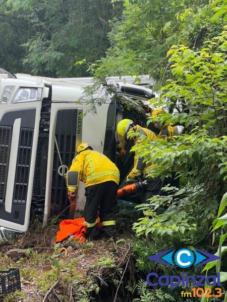 Caminhoneiro é resgatado após ficar preso na cabine em tombamento na SC-283, em Seara
