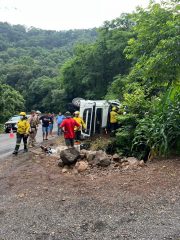 Segundo relato do próprio motorista, o pneu dianteiro direito estourou, ocasionando a perda de controle do veículo e o tombamento. A vítima estava consciente e orientada, não relatava dores nos membros, tórax ou coluna cervical, informando apenas que não conseguia sair sozinha do caminhão.