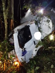 Ao chegar ao local, as equipes constataram que o veículo havia parado cerca de 20 metros fora da rodovia, em uma área de difícil acesso. Durante o protocolo de resgate veicular, o condutor, um homem de 50 anos, foi localizado já sem sinais vitais, com suspeita de politraumatismo.