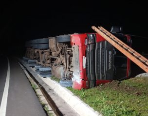 Uma carreta que transportava grãos de algodão tombou às margens da BR-158, em Cunha Porã, nas primeiras horas desta quarta-feira, 3 de novembro, deixando o motorista levemente ferido. O acidente ocorreu por volta das 4h20min e mobilizou o Corpo de Bombeiros.