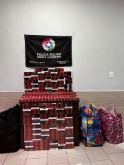 Durante a abordagem, os policiais realizaram entrevista com os passageiros e, diante do itinerário da viagem, efetuaram buscas no compartimento de bagagens. Em duas bagagens pertencentes a um casal, foram encontrados diversos brinquedos repetidos com indício de comércio e grande quantidade de cigarros da marca Gudang, de origem estrangeira.