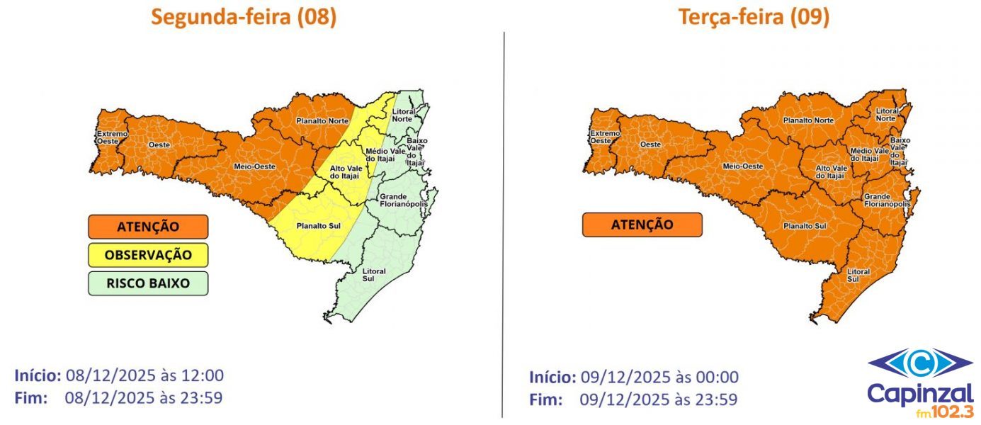 A partir de segunda-feira (08), a aproximação do ciclone começa a afetar o estado. O dia começa com sol e temperaturas elevadas, mas com o avanço da nebulosidade, o risco de temporais aumenta. Na tarde de segunda-feira, o Oeste catarinense já deverá enfrentar chuvas intensas, ventos fortes e possível queda de granizo. A partir daí, o fenômeno avança para as regiões do Grande Oeste e Planalto Norte, onde o risco de alagamentos, enxurradas, destelhamentos e danos à rede elétrica será alto. Nas regiões do Planalto Sul e Vale do Itajaí, o risco é moderado, e no litoral os temporais serão mais isolados, com baixo risco.