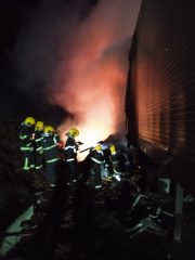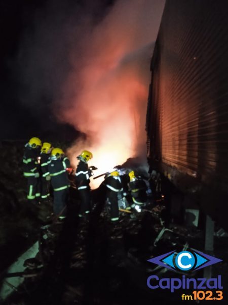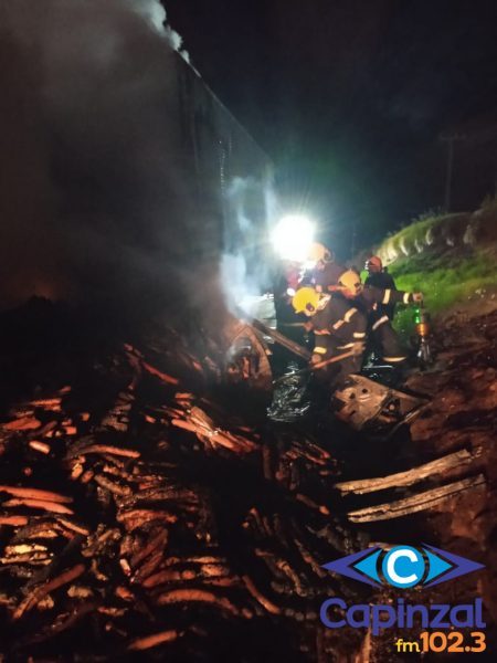 No local, os bombeiros constataram que o carro de passeio havia sido tomado pelas chamas após uma colisão lateral com a carreta. O incêndio estava em desenvolvimento completo, sendo necessário o combate direto ao fogo antes do acesso ao interior do veículo.