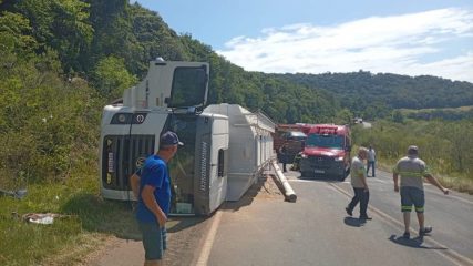 O acidente envolveu dois caminhões. Entre os veículos estão um caminhão de transporte de ração com placas do Mercosul que acabou tombando sobre a pista, e um segundo caminhão com placas de Irani que transportava um veículo na carroceria.
