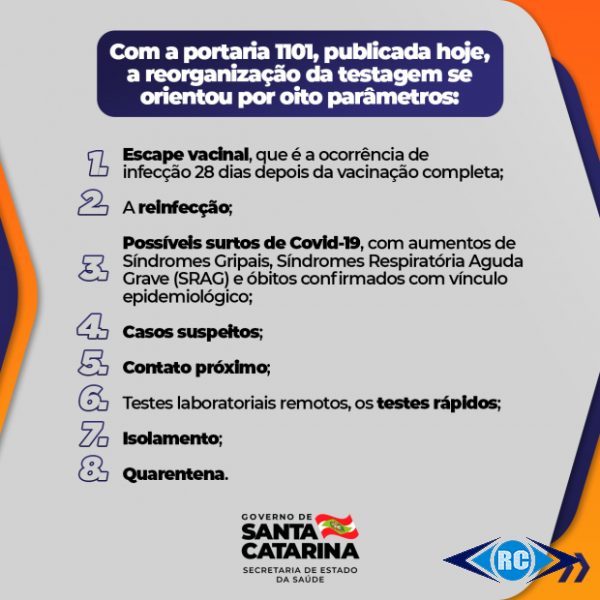 Nesta segunda-feira, 11, o Diário Oficial do Estado publicou a portaria SES 1101, que servirá para reorganizar fluxos e critérios para realização da estratégia de testagem ampliada para o Coronavírus em Santa Catarina. A portaria considera, nas suas nove páginas, o escape vacinal, que é a ocorrência de infecção 28 dias depois da vacinação completa, a reinfecção, possíveis surtos de Covid-19, com aumentos de Síndromes Gripais, Síndromes Respiratória Aguda Grave (SRAG) e óbitos confirmados com vínculo epidemiológico, além de casos suspeitos, testes laboratoriais remotos, contato próximo, isolamento e tipos necessários de quarentena.